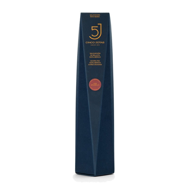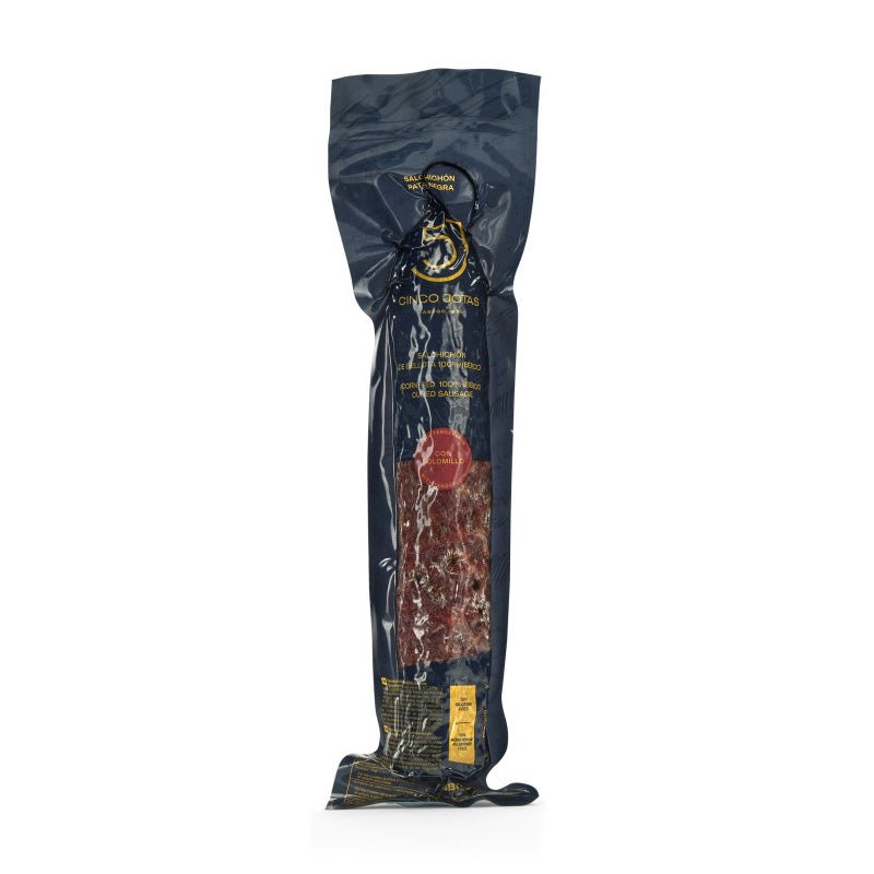 En Cinco Jotas superamos las más estrictas normas de calidad para obtener un producto extraordinario e inconfundible: el Salchichón de bellota 100% ibérico, o brida negra.